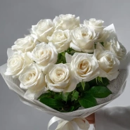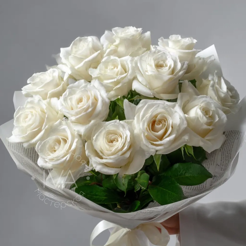 Белоснежные розы в холодной палитре — для ценителей минимализма и лаконичности. Эстетичный и сдержанный букет, который подойдёт как для деловых поздравлений, так и для трогательных моментов.