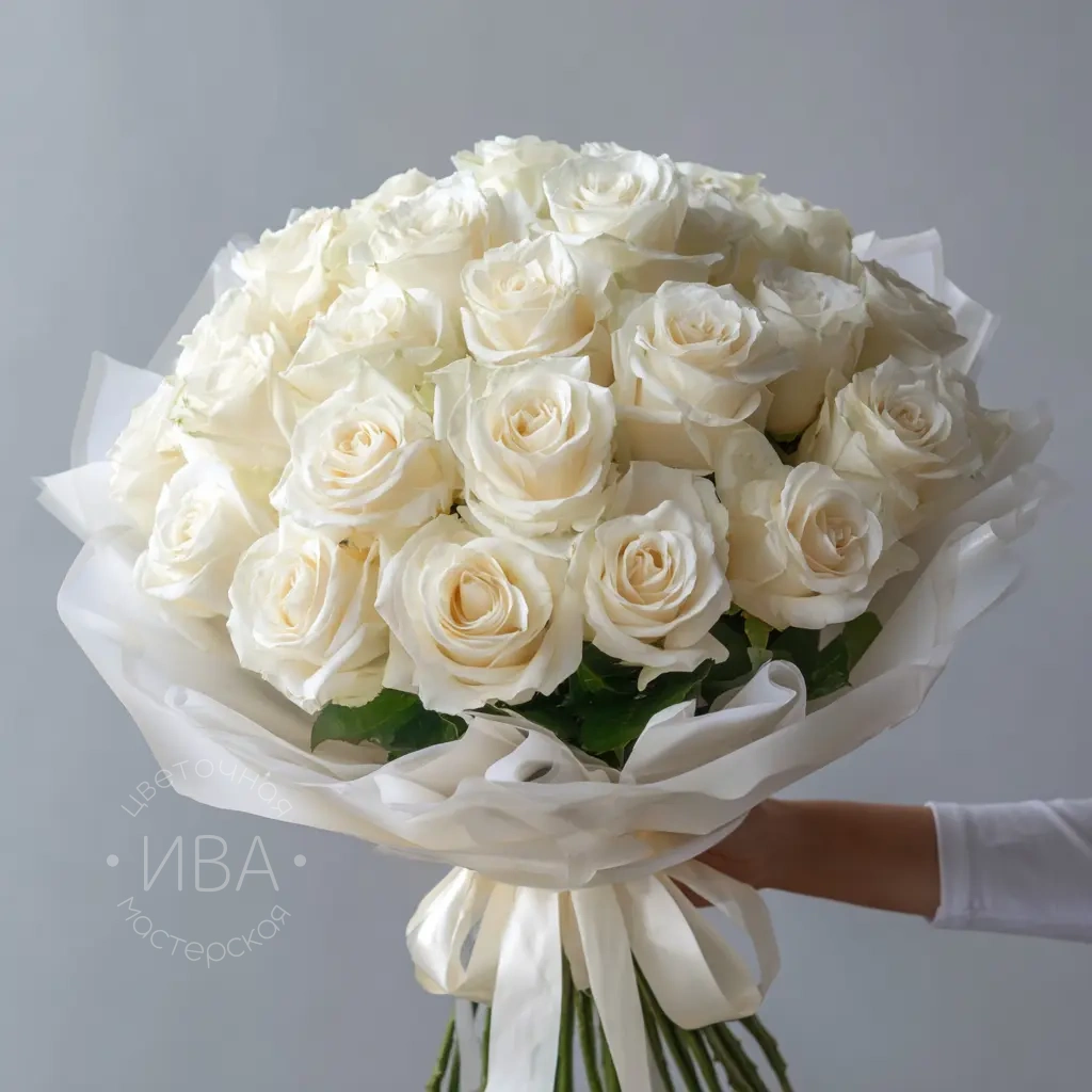Нежный и лёгкий букет из белых роз, словно облака с каплей утреннего аромата. Прекрасен как подарок для романтических случаев или в качестве комплимента без повода. Сочетает свежесть и деликатность.