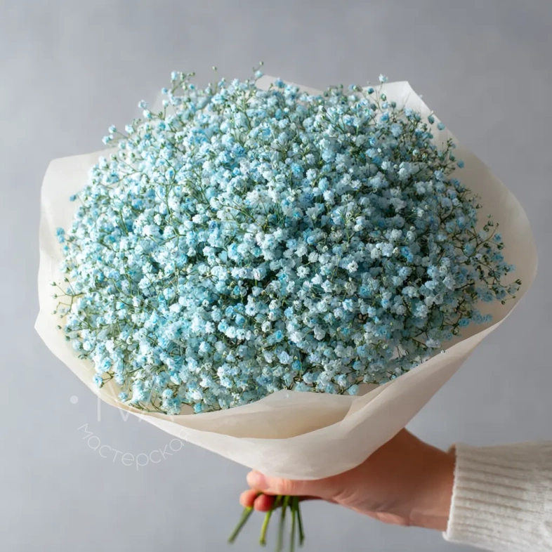 Современный и стильный выбор. Голубая гипсофила — тренд последних сезонов, отлично смотрится в фото- и видеосъёмках. Такой букет подойдёт как для молодёжных мероприятий, так и для оригинального комплимента.