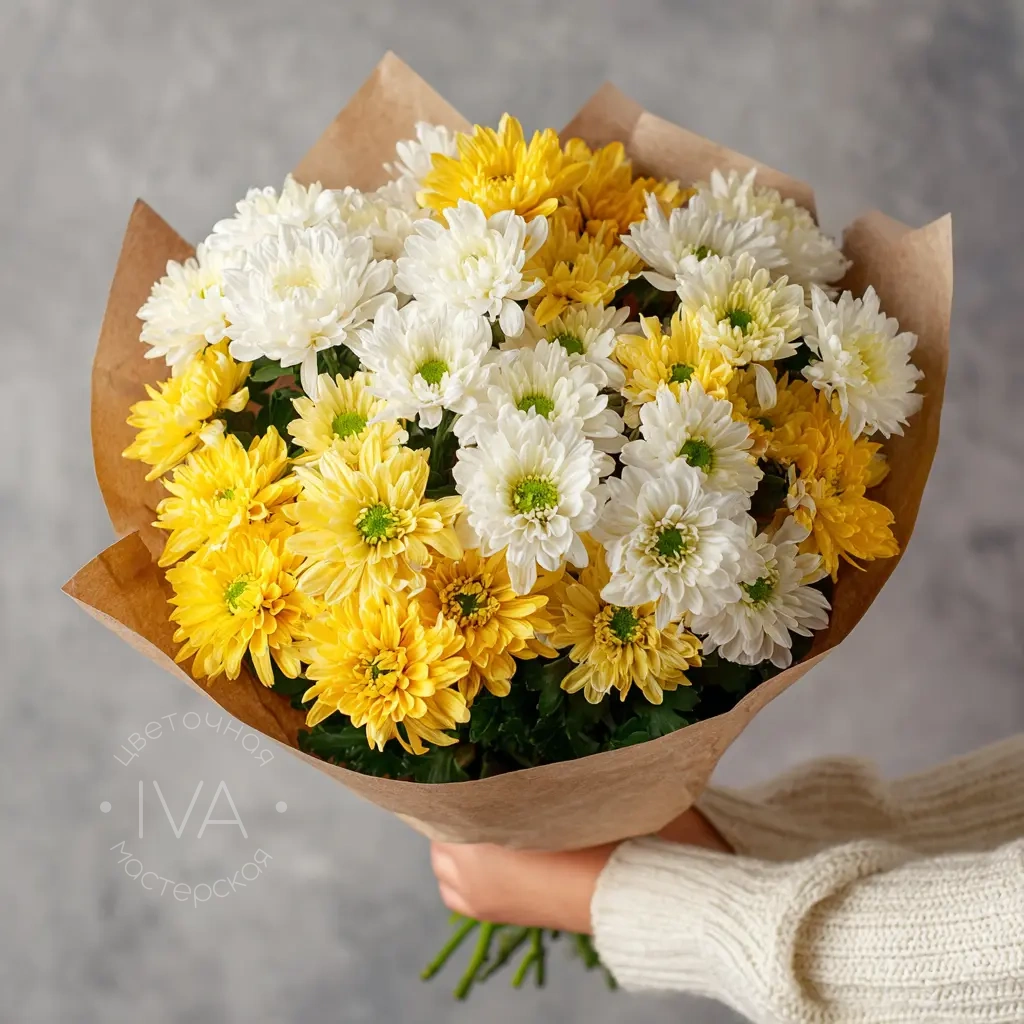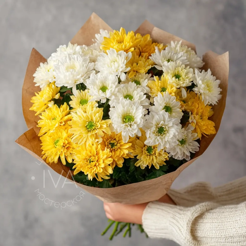 Создан специально для осенних дней — уютный, тёплый, с нотками меланхолии. Букет из хризантем идеально подходит для 1 сентября, Дня учителя или сезонного декора.