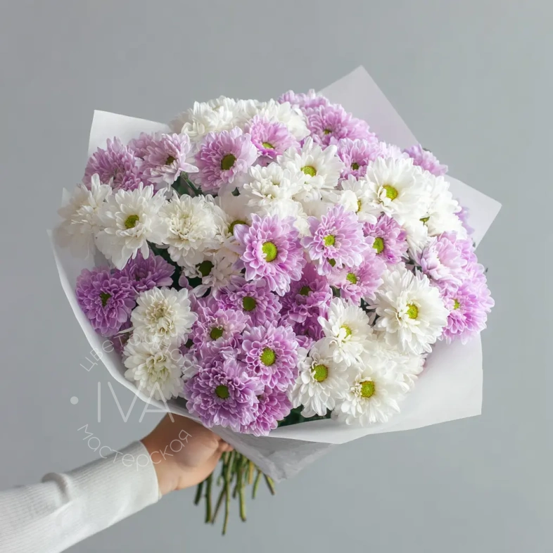 Цветовая нежность делает букет выразительным, а хризантемы обеспечивают стойкость и эффектность на несколько дней.