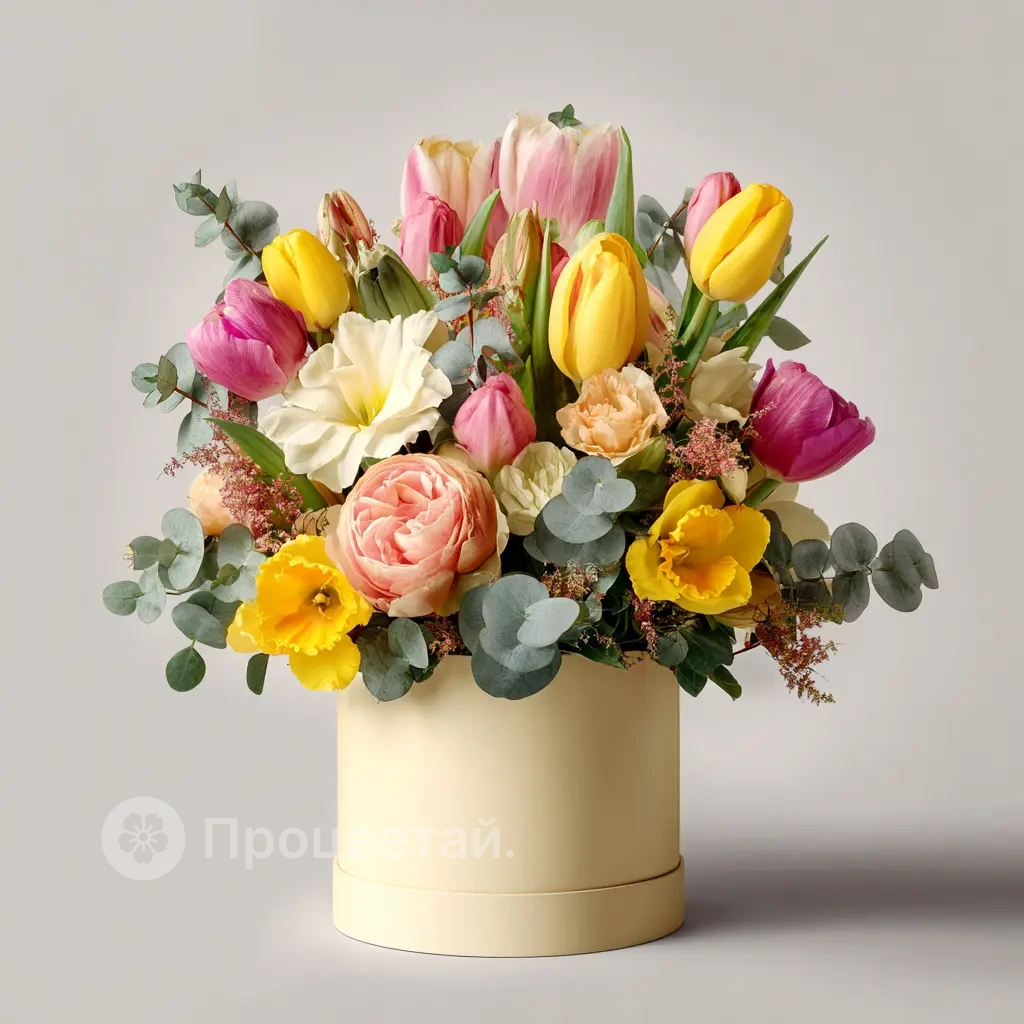 Яркая композиция с тюльпанами, нарциссами, которая наполняет пространство свежестью и радостью весны. Идеально для подарка или украшения.
