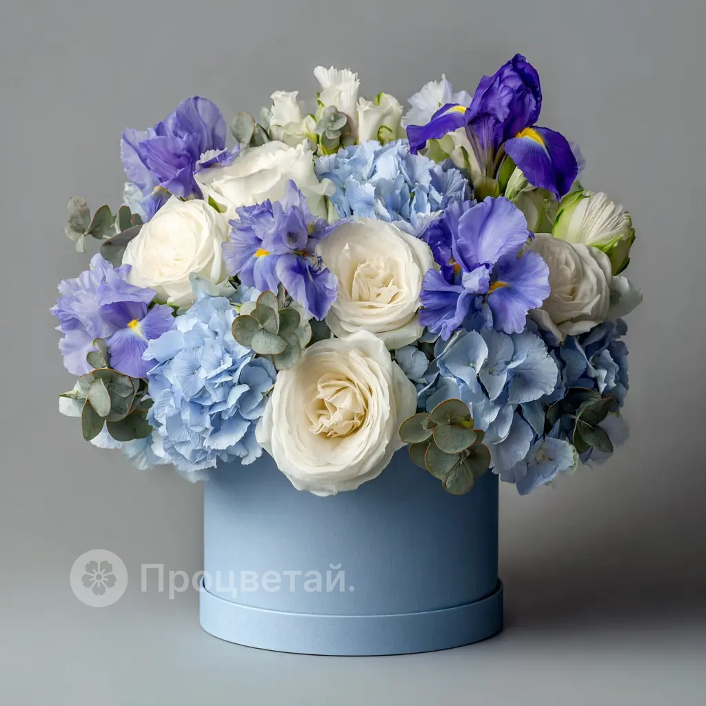 Фиолетовые ирисы, белые розы и зелень эвкалипта создают ощущение морского бриза и спокойствия.