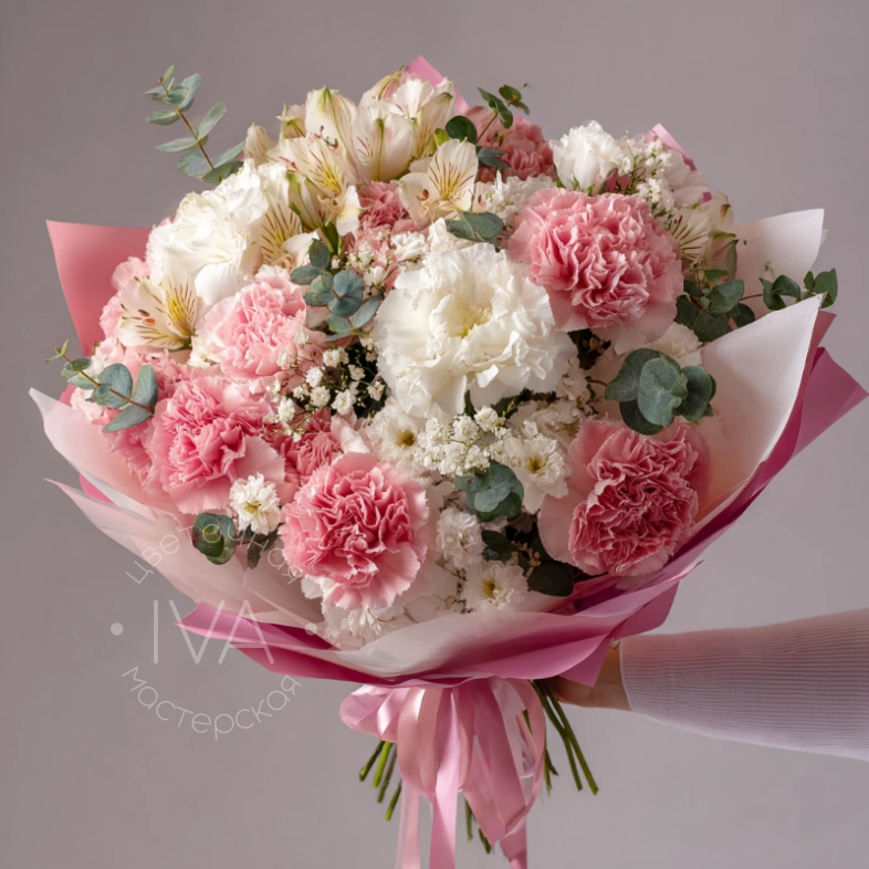 Нежность розовых гвоздик и свежесть зелени — гармония, которая покоряет с первого взгляда.