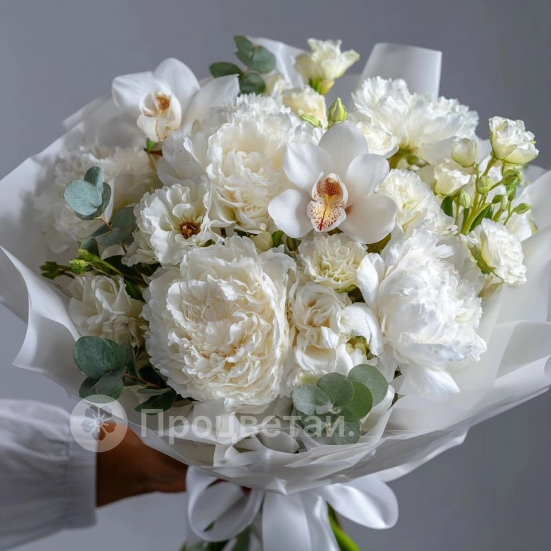 Чистый, белоснежный букет с пионами. Минимализм и утончённость в одной композиции. Подходит для свадеб, фотосессий и подарков «без повода».