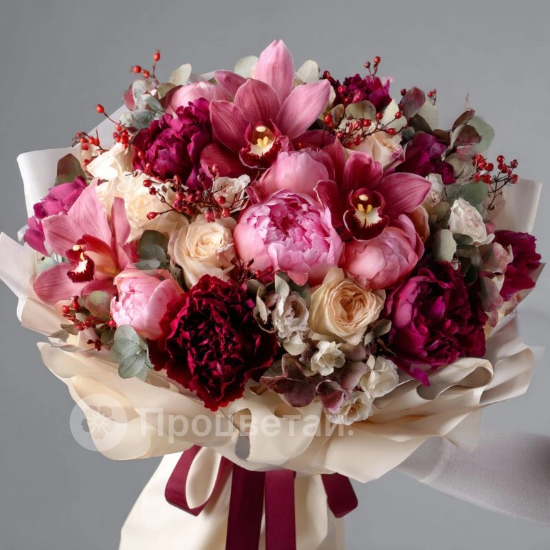 ГлавнаяКаталогБукетыБукет с пионами «Рубиновая вуаль»