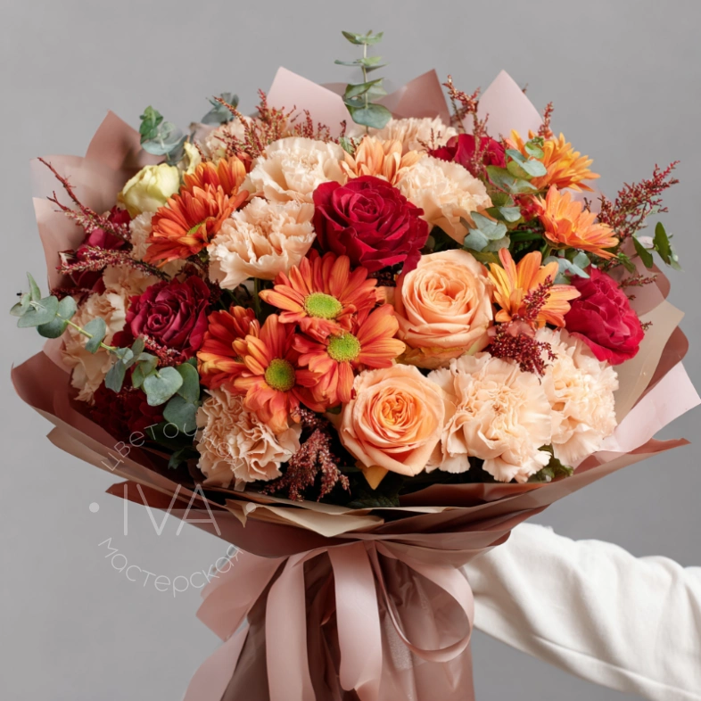 Как разноцветные листья, кружатся оттенки хризантем в этом букете. Каждый цвет — эмоция, каждое соцветие — послание. Букет идеально подойдёт для выразительных подарков в осенний период.