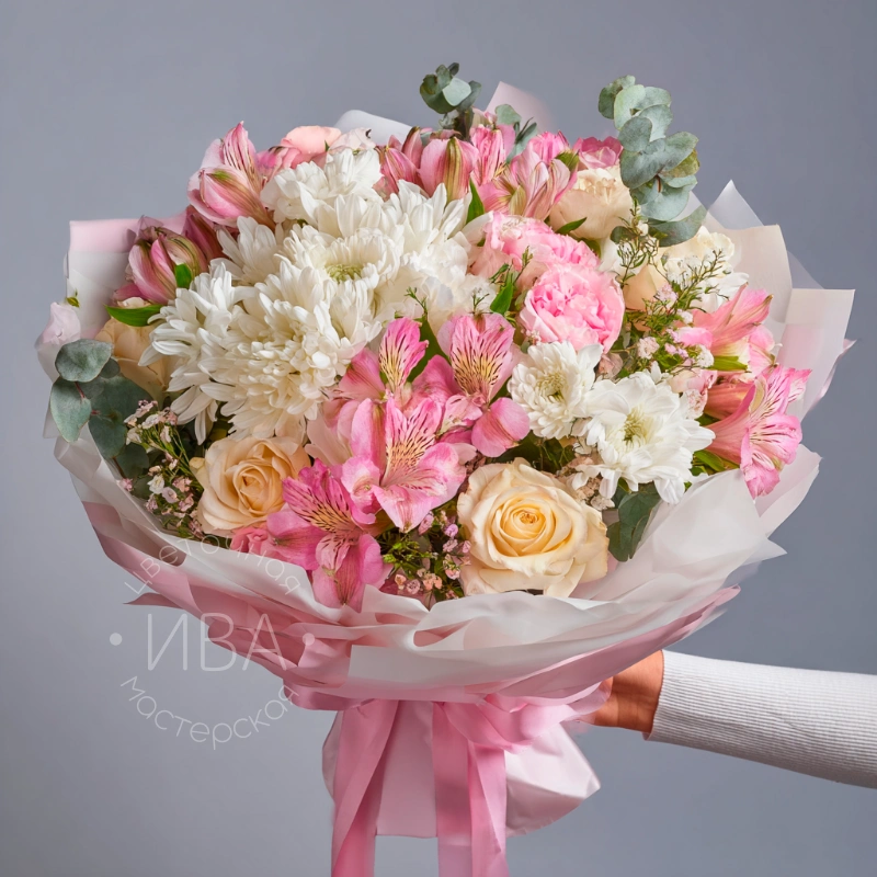 Сдержанная композиция в светлой гамме с белыми, кремовыми и розовыми оттенками. Хризантемы символизируют чистоту и уважение, а оформление делает букет универсальным для любого случая.