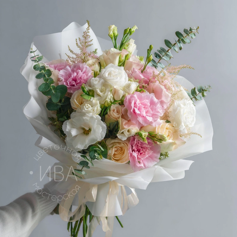 Лёгкий, невесомый букет с эустомами, словно прикосновение ветра. Его выбирают, когда хочется подарить заботу, тепло и искренние чувства. Подойдёт для признания, благодарности или утреннего сюрприза.