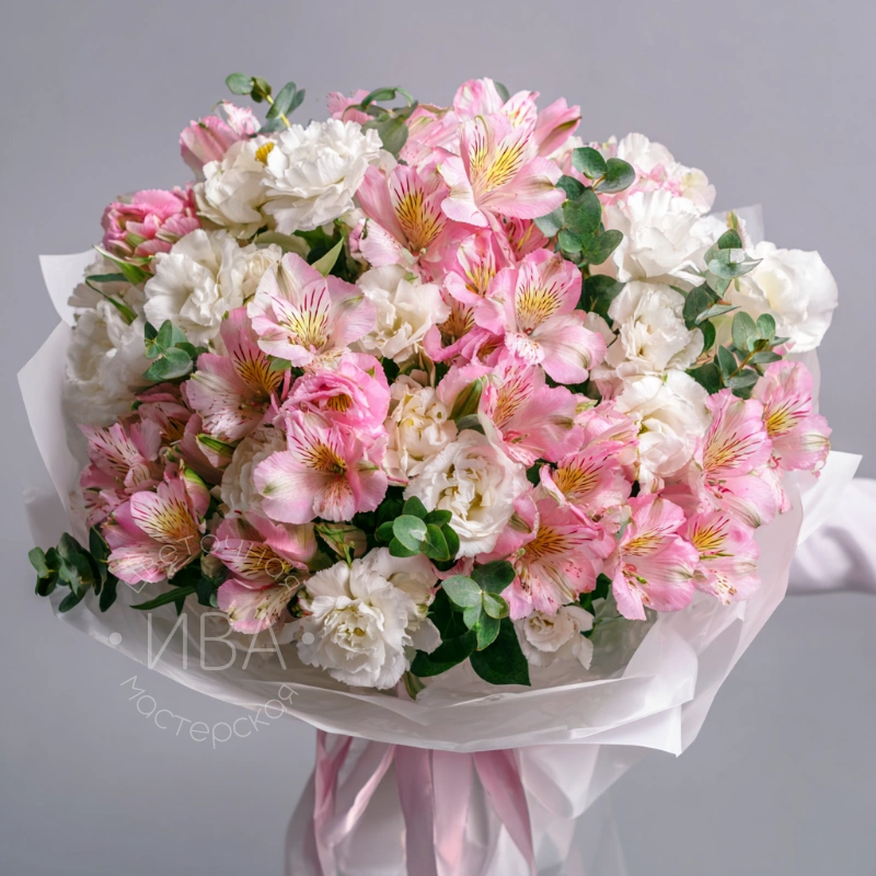 Белые эустомы создают образ вдохновляющей легкости. Букет символизирует ясность мыслей и чистоту намерений. Хороший вариант для творческих людей или особенных дат.