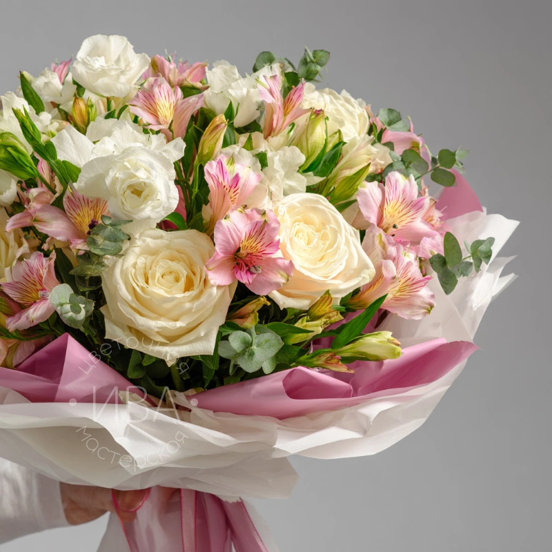 Трепетный, «припудренный» букет с эустомами в нежной палитре. Его выбирают те, кто хочет подчеркнуть деликатность и тонкость чувств. Эстетичный подарок, который останется в сердце.