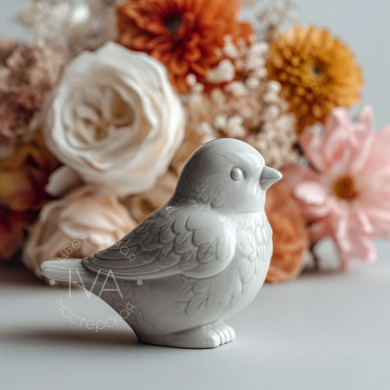 Очаровательная керамическая птичка станет изящным дополнением к любому букету или цветочной композиции. Этот миниатюрный сувенир символизирует нежность и приносит в дом уютное настроение.