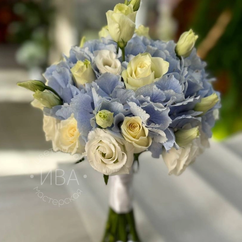 ГлавнаяСвадебный букет с гортензией, эустомой