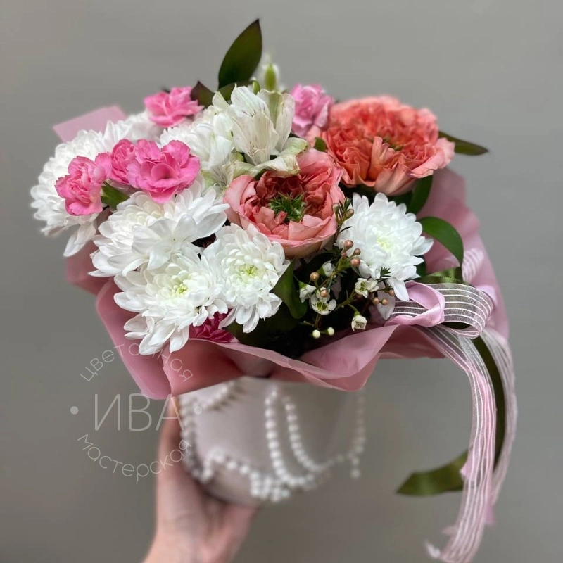 Мишка с хризантемой, розой и эустомой