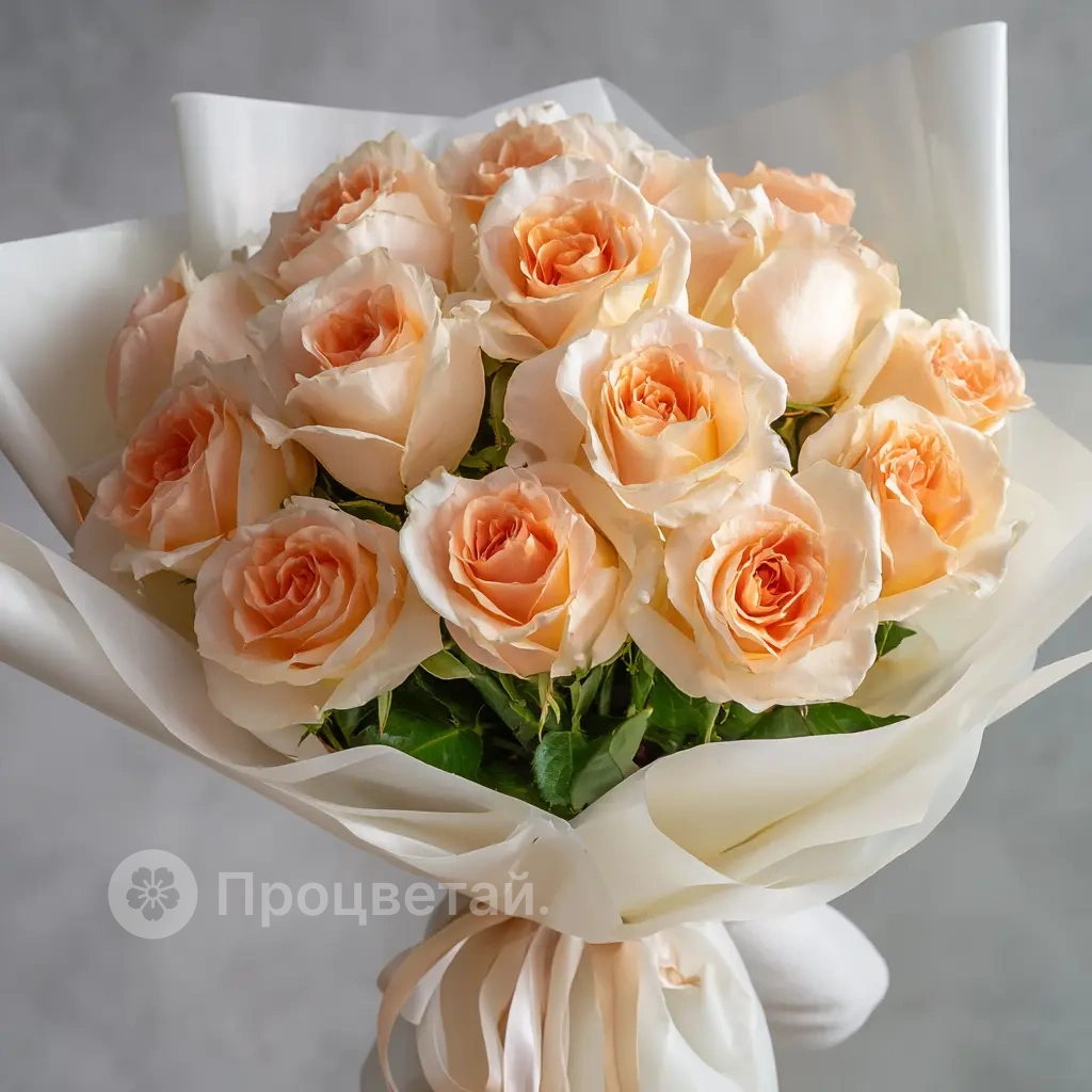 Мягкий, пастельный букет из 15 персиковых эквадорских роз подойдёт для изысканного подарка на день рождения, юбилей или свадебную годовщину. Персиковый цвет — символ благодарности и тёплого отношения.